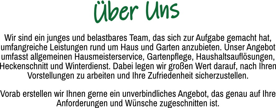 Wir sind ein junges und belastbares Team, das sich zur Aufgabe gemacht hat, umfangreiche Leistungen rund um Haus und Garten anzubieten. Unser Angebot umfasst allgemeinen Hausmeisterservice, Gartenpflege, Haushaltsauflösungen, Heckenschnitt und Winterdienst. Dabei legen wir großen Wert darauf, nach Ihren Vorstellungen zu arbeiten und Ihre Zufriedenheit sicherzustellen.
