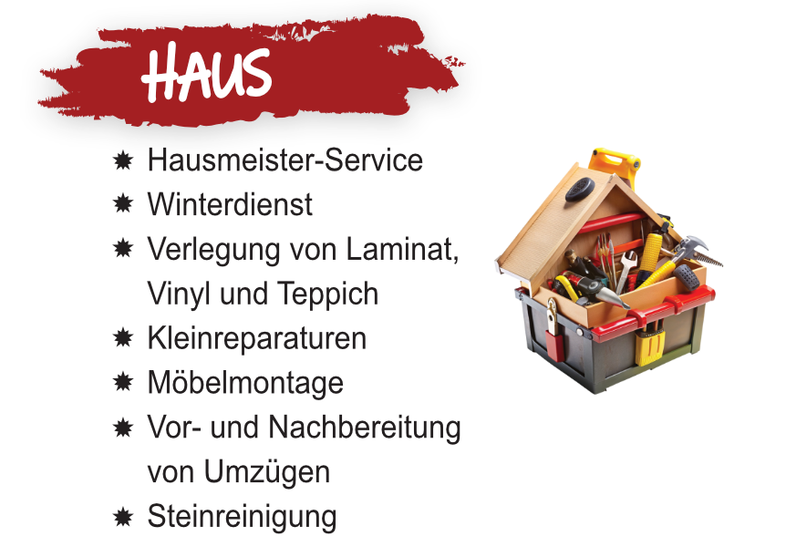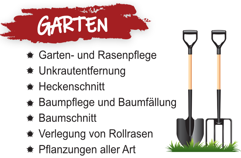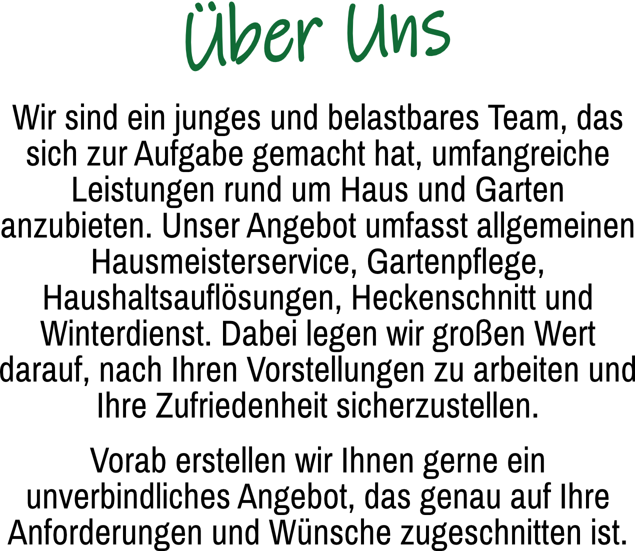 Wir sind ein junges und belastbares Team, das sich zur Aufgabe gemacht hat, umfangreiche Leistungen rund um Haus und Garten anzubieten. Unser Angebot umfasst allgemeinen Hausmeisterservice, Gartenpflege, Haushaltsauflösungen, Heckenschnitt und Winterdienst. Dabei legen wir großen Wert darauf, nach Ihren Vorstellungen zu arbeiten und Ihre Zufriedenheit sicherzustellen.